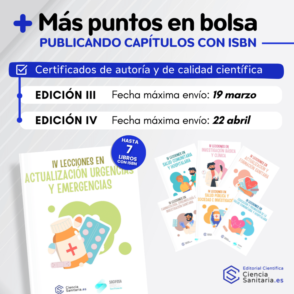 Las publicaciones científicas de capítulos de libro son un mérito que se reconoce en la gran mayoría de las bolsas de empleo del sistema sanitario español. Son un tipo de publicación relativamente sencilla al permitir al autor o autores del capítulo dirigir la exposición del trabajo científico repartida en los diferentes apartados estructurados según el tipo de trabajo que se quiera publicar ( estudio con resultados, proyecto de investigación. caso clínico, series de casos…).